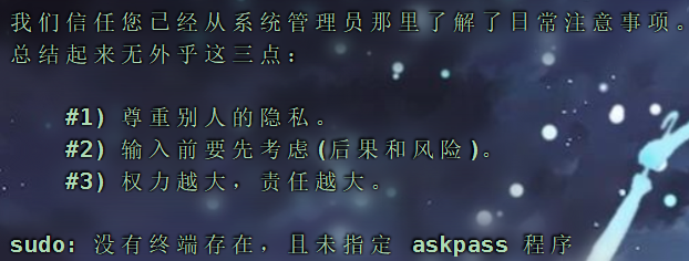 注:visudo文件中切记NOPASSWD必须要写,否则会报错。如下图。这是因为执行计划时是在后台的一个新建终端中执行的,且我们不能查看和切换到这个终端。因为其他用户在执行脚本时会需要输入密码,而我们又不能切换到该终端输入密码,所以计划最终将会无法执行。