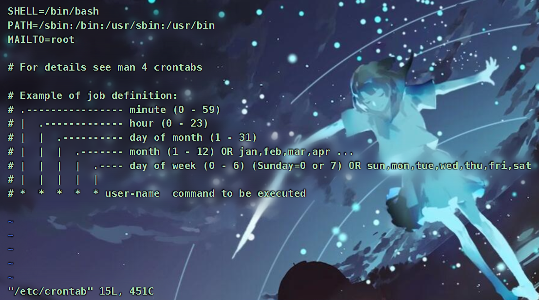1 2 3 4 [root@c-6 ~]# crontab -u jack -e #使用jack用户创建 [root@c-6 ~]# crontab -u jack -l #查看jack用户的计划任务 [root@c-6 ~]# crontab -r #删除当前用户的计划任务 [root@c-6 ~]# crontab -u jack -r #删除jack用户的计划任务