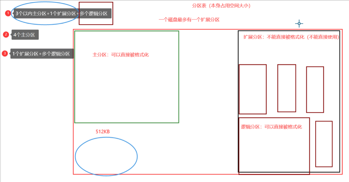 1.2 从磁盘分区方式区分 1 2 3 4 5 MBR (MSDOS根据分区表来分区的,又叫做主引导扇区) <2TB 分区工具:fdisk 一共可以分14个分区(4个主分区,扩展分区,逻辑分区) 例如: 3主 + 1扩展(n逻辑) MBR 小于2TB的可以。 一块硬盘最多分4个主分区。