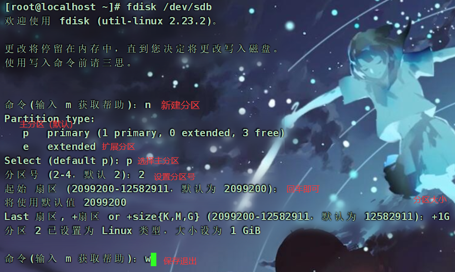 1 2 3 # lsblk 查看分区结果 【如果分区后无法发现分区结果,请{刷新分区表}后再次查看】 # partprobe /dev/sdb