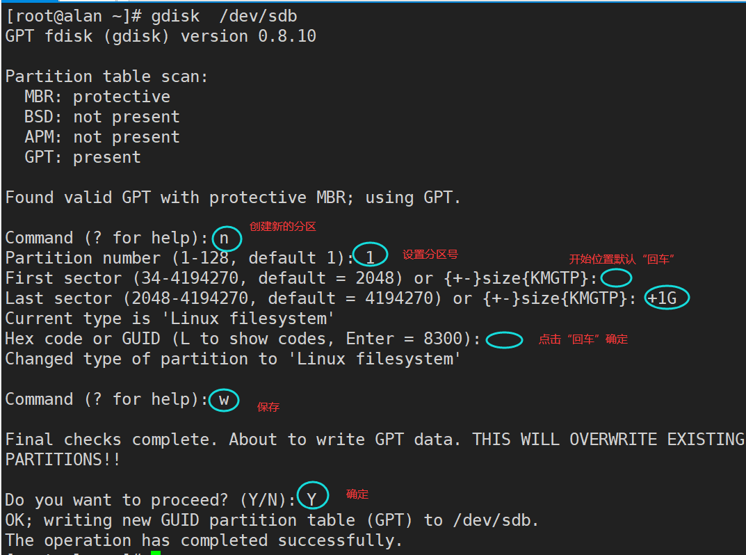 2.2.1 创建分区 1 2 3 [root@qfedu.com ~]# yum -y install gdisk #安装分区工具 [root@qfedu.com ~]# gdisk -l /dev/sdb [root@qfedu.com ~]# gdisk /dev/sdb