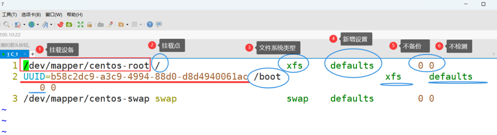 三.fstab开机自动挂载 3.1 /etc/fstab文件实现开机的时候自动挂载 1 2 3 4 5 6 7 8 9 10 11 12 [root@qfedu.com ~]# blkid /dev/sdb1 #查看uuid和文件系统类型 /dev/sdb1: UUID="d1916638-bd0a-4474-8051-f788116a3a92" TYPE="ext4" [root@qfedu.com ~]# vim /etc/fstab 参数解释: 第1列:挂载设备 (1)/dev/sda5 (2)UUID=设备的uuid(设备ID号) rhel6/7的默认写法 同一台机器内唯一的一个设备标识 第2列:挂载点 第3列:文件系统类型 第4列:文件系统属性 第5列:是否对文件系统进行磁带备份:0 不备份 第6列:是否检查文件系统:0 不检查